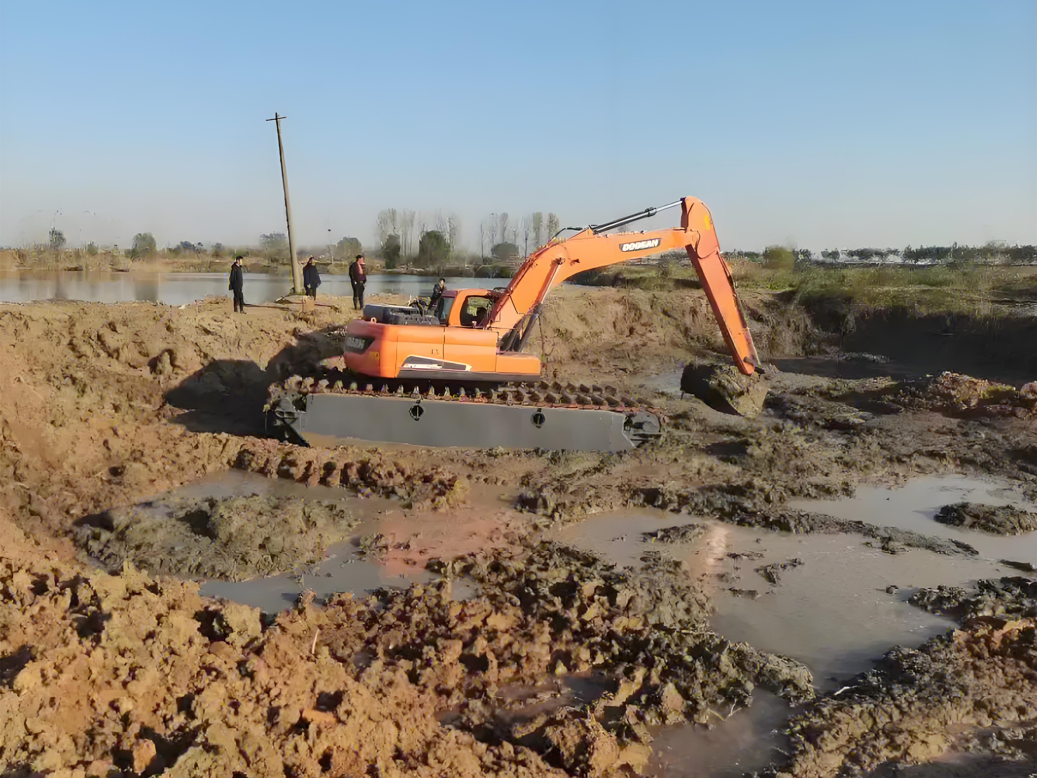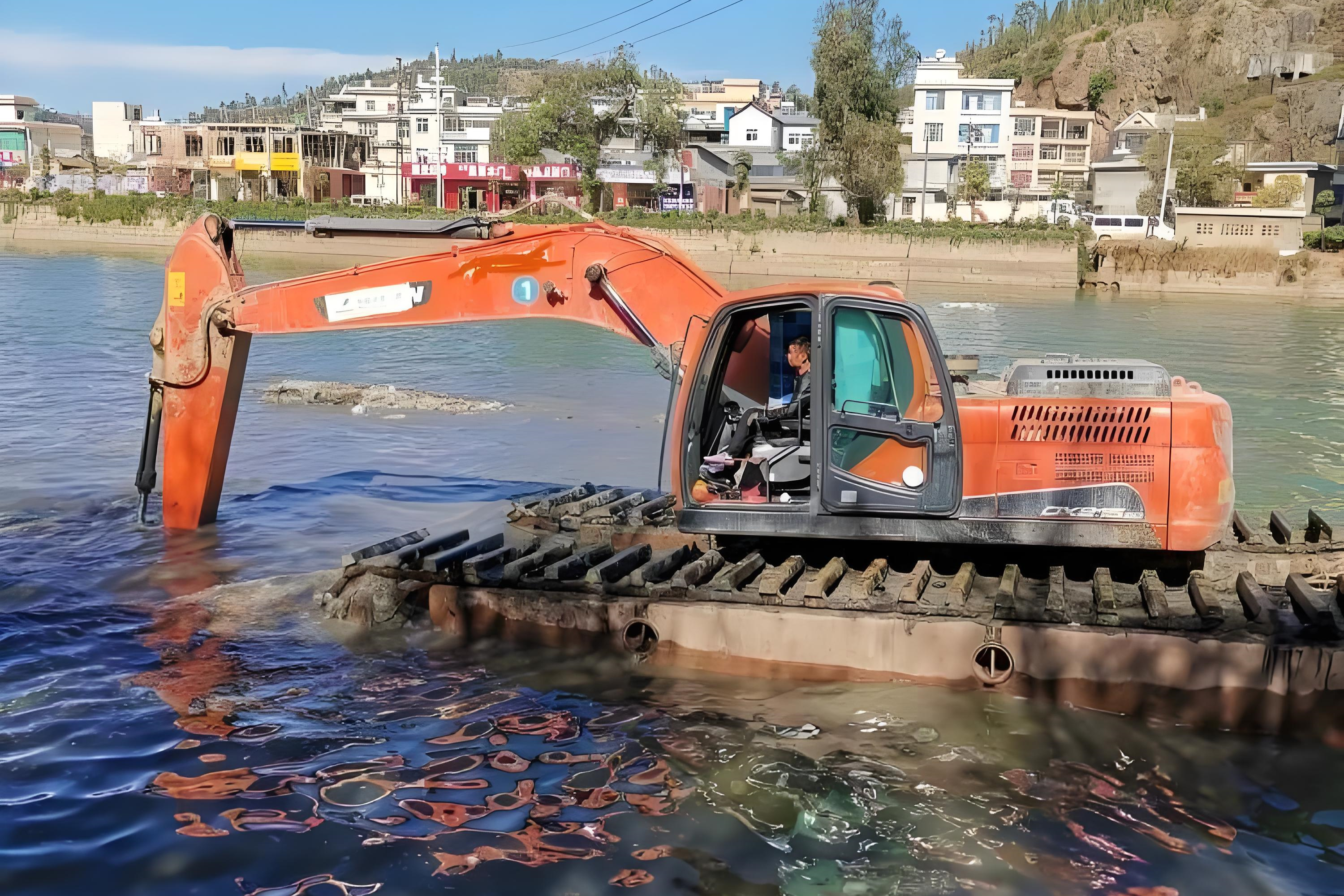 2. 兩棲式水上挖機(jī):最低水深 0.3 米,適合淺水域